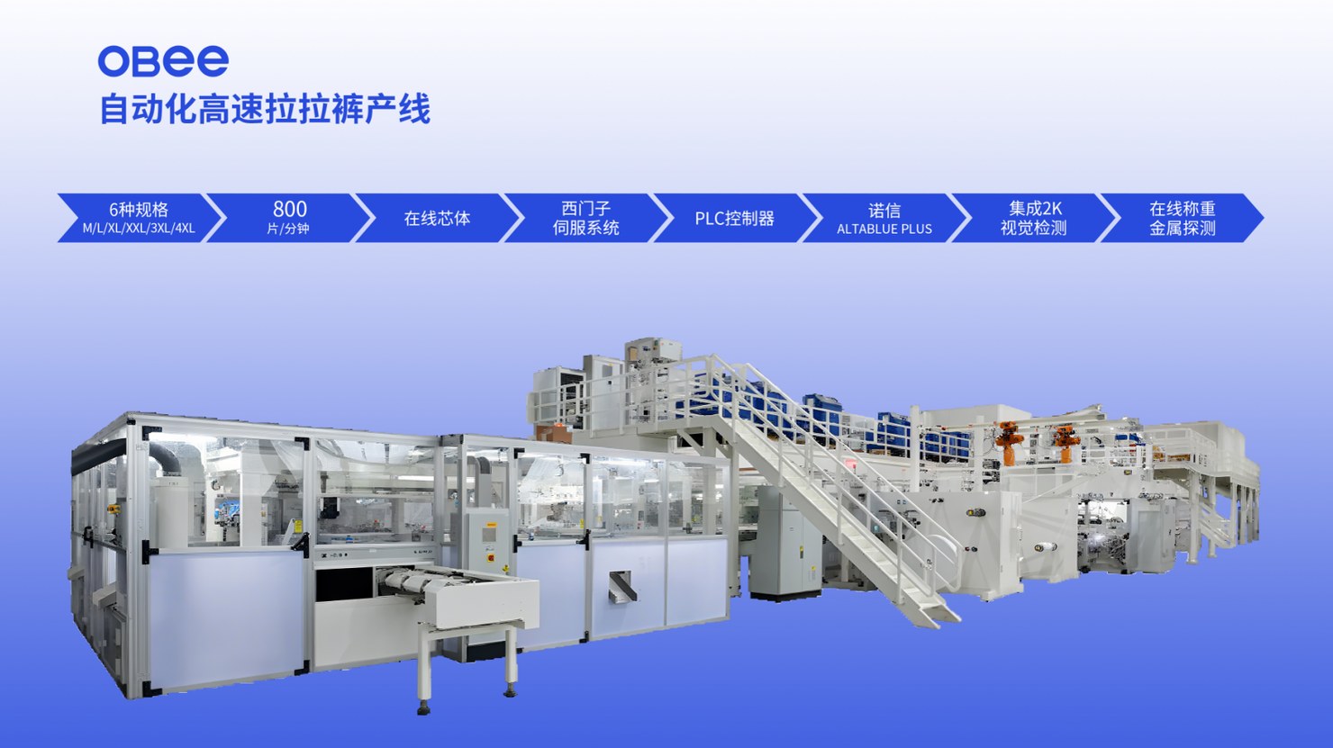 恒昌全伺服高速智能婴儿拉拉裤生产线(4条)稳定线速达800pcs/min,全线配备污点检测、金属检测、强磁力吸、皮带称重,同时配有自动堆垛机和全自动装袋封口一体机;批量全码产出仅需1天,品质与交付双重保障。